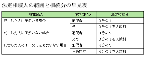 親が亡くなった場合、誰が親の遺産を引き継ぐ権利があるのか、簡単に下記の表にまとめてみましたのでご参考にしてください。